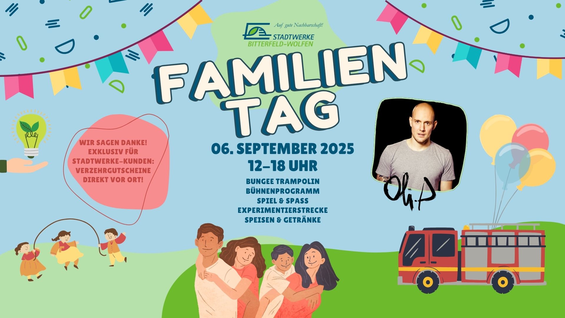 Unsere Highlights zum Familienfest: - Starauftritt von Oli P. und weitere tolle Bühnenauftritte - Bungee Trampolin (kostenlos) - Spiel und Spaß - Experimentierstrecke - Speisen und Getränke