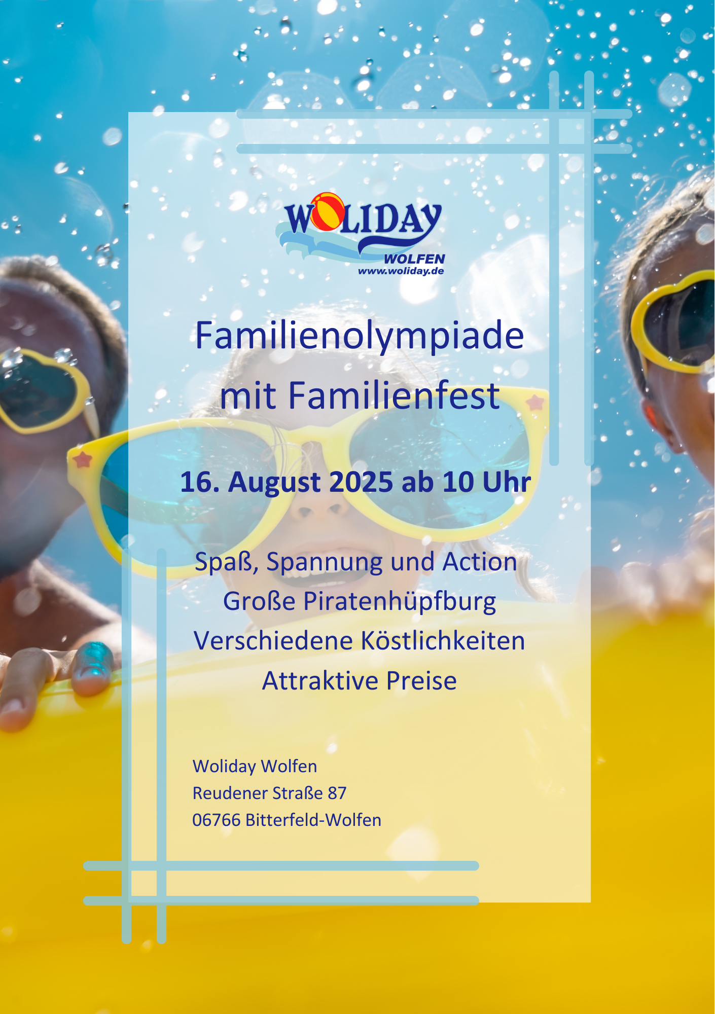 Am 16.08. findet im Woliday Wolfen die Familienolympiade mit Poolevents statt. Von 10 - 15 Uhr gibt es spannende Spiele, Spaß, Action und tolle Preise für Klein und Groß. Währenddessen und auch im Anschluss ist mit einer großen Piratenhüpfburg und verschiedenen Köstlichkeiten für euer Wohl gesorgt. Wir freuen uns auf euch!