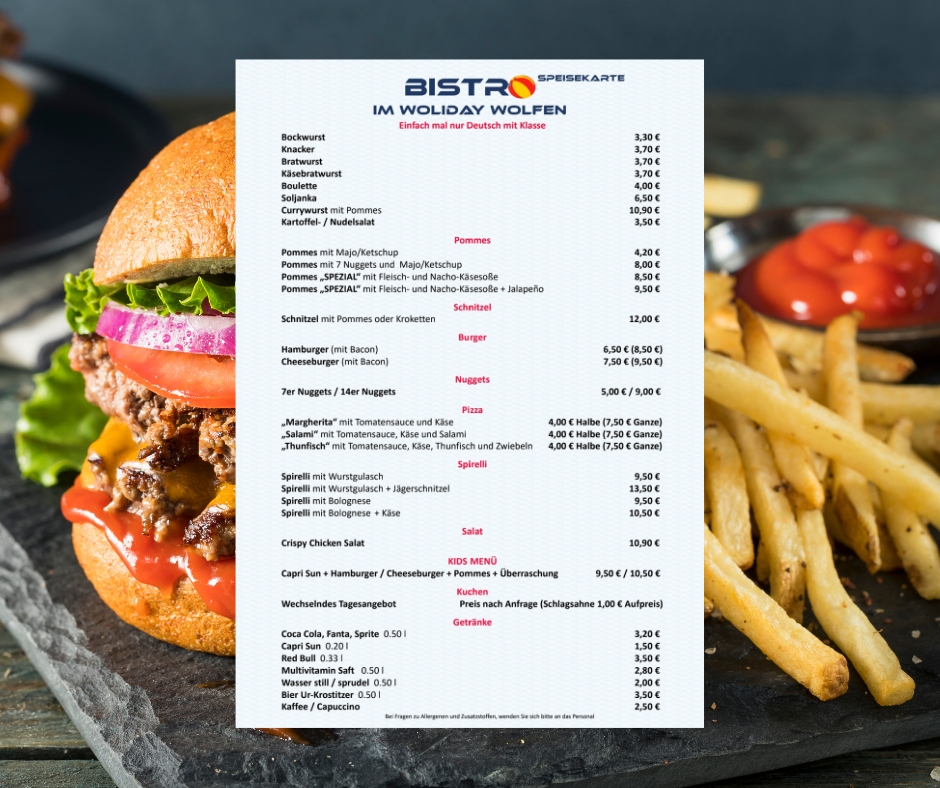 Seit dem 01. April haben wir einen neuen Bistro-Betreiber. Ab sofort erwartet Sie eine vielfältige Menüauswahl. Hier ist für jeden Geschmack etwas dabei. Kommen Sie vorbei uns lassen Sie sich überzeugen.