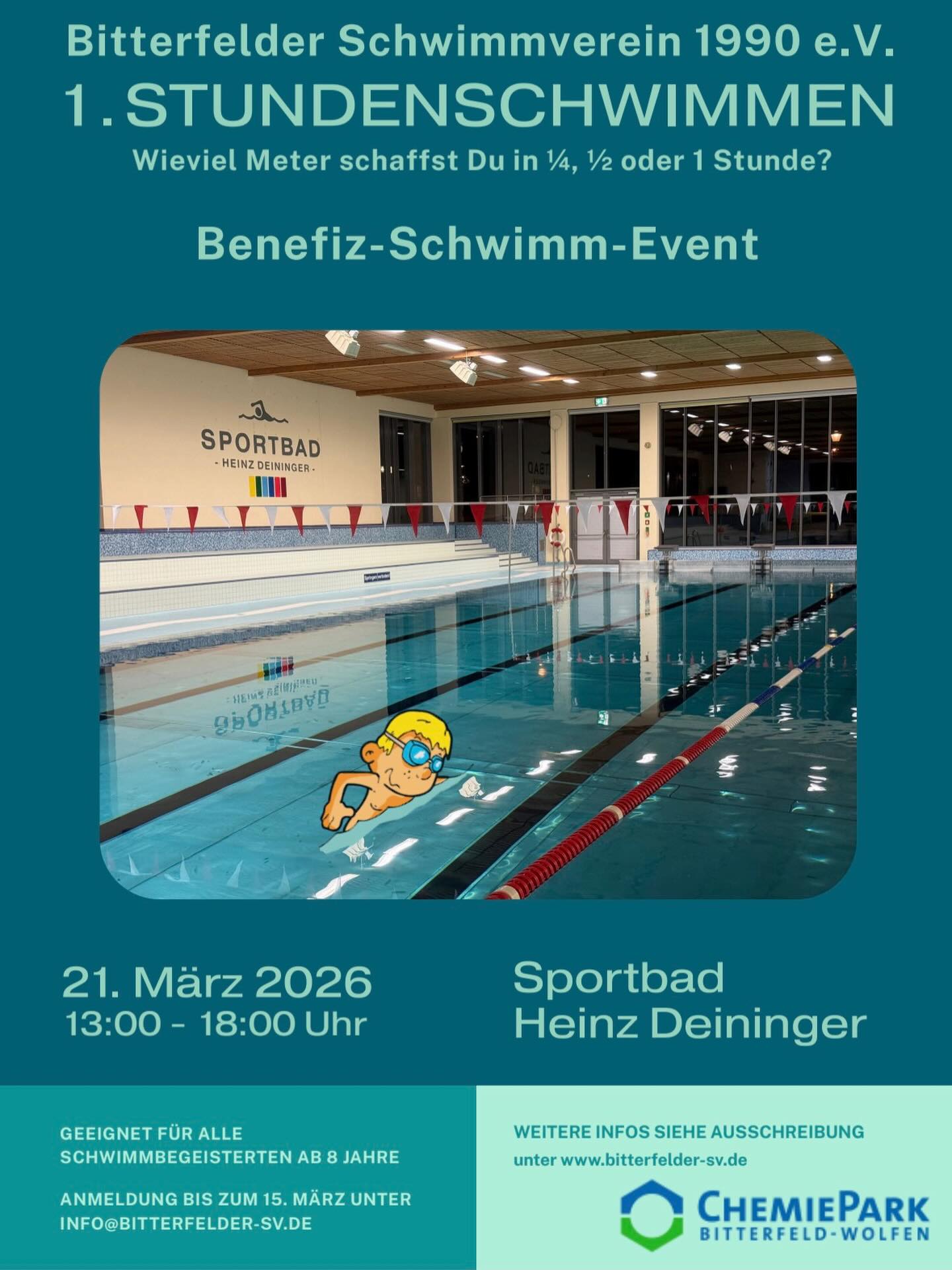Wie viel Meter schaffst Du in 1/2 Stunde? Wie viel Meter schaffst du in 1 Stunde? Zeig es uns beim Benefiz-Schwimm-Event des Bitterfelder Schwimmvereins e.V. am 21.03.2026 von 13-16 Uhr. Alle Schwimmbegeisterten ab 8 Jahren können teilnehmen. Die Anmeldung muss bis zum 15.03.2026 unter info@bitterfelder-sv.de erfolgen.