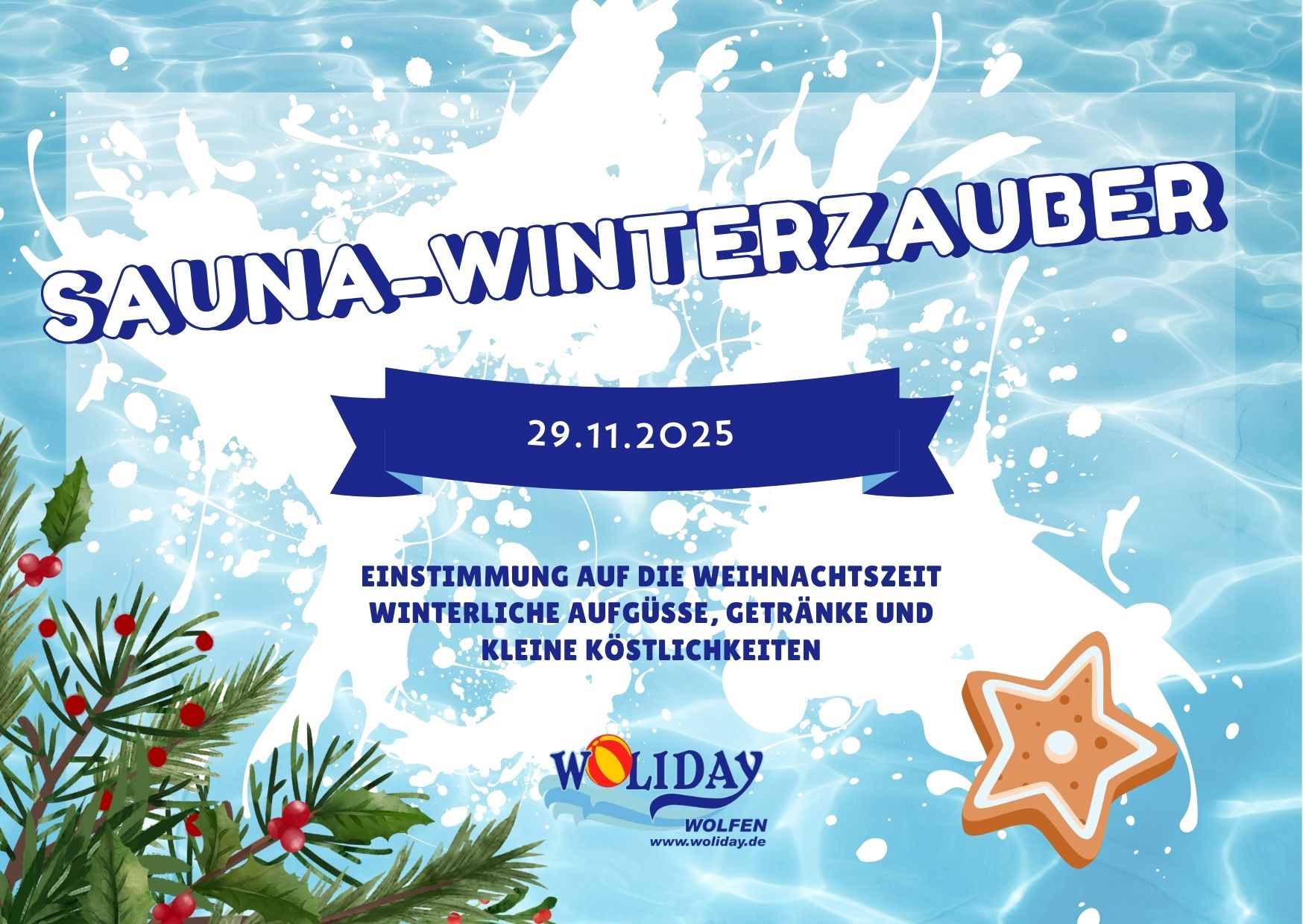 Am 29. November 2025 lädt die Sauna des Wolidays zu der stimmungsvollen Veranstaltung „Winterzauber“ ein. Tauchen Sie ein in eine gemütliche, festliche Atmosphäre, in der wir uns gemeinsam auf die Weihnachtszeit einstimmen. Die wohlige Wärme der Sauna sorgt für Entspannung, während weihnachtliche Aufgüsse für ein besonderes Dufterlebnis sorgen. Ergänzt wird das sinnliche Erlebnis durch passende Getränke, die die Vorfreude auf die festliche Jahreszeit unterstützen